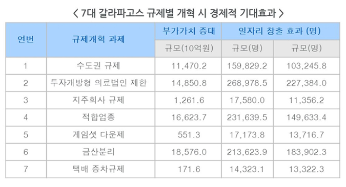 선정 기준은 ▲글로벌 기준에 부합하지 않고 ▲규제개혁의 경제적 효과를 계량화할 수 있으며 ▲규제개혁의 경제적 효과가 크지만 ▲이해자 반발이나 정치·사회적 이유 등으로 개혁추진이 어려운 과제 등이다. 전경련은 계량화된 선행연구와 가정에 기초하여 7대 갈라파고스 규제개혁의 부가가치 창출효과를 산출한 후, 한국은행이 발표하는 산업별 취업 유발계수를 곱해서 일자리 창출효과를 추산했다고 설명했다.