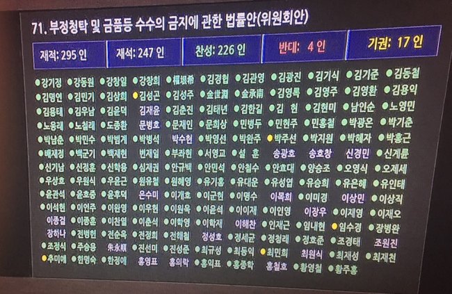 이제와서 김영란법을 폐기하자는 논란은 의미가 없다. 사회적으로 부패의 고리를 끊어야 한다는데 반기를 들 명분이나 이유가 있을 수 없다. 하지만 법으로써 모순이 있다면 고쳐야하고 법제정을 통해 얻을 수 있는 이익보다 잃어버릴 수 있는 폐해가 있다면 고쳐야 한다.