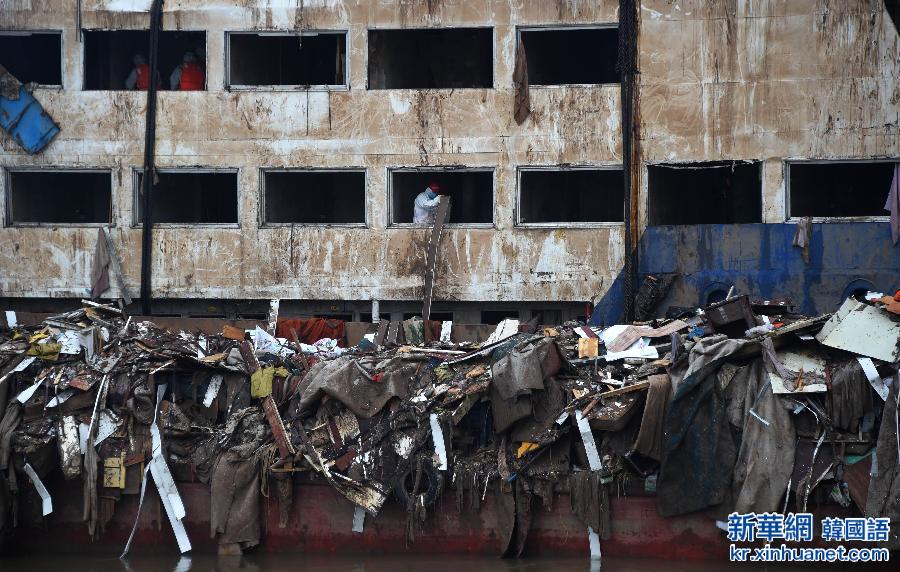 ▲ [젠리=신화사 뉴스웍스] 9일 중국 해방군 후베이(湖北)성 군구의 모 주교여(舟橋旅)단이 양쯔강에서 침몰한 여객선 '둥팡즈싱(東方之星)'호의 선체에 대한 전면적인 정리 작업을 하고 있다. 지난 8일까지 조난자들의 유품 1500점과 잡물 200여톤이 수습됐다.(서울=뉴스웍스) 이효영 기자 =