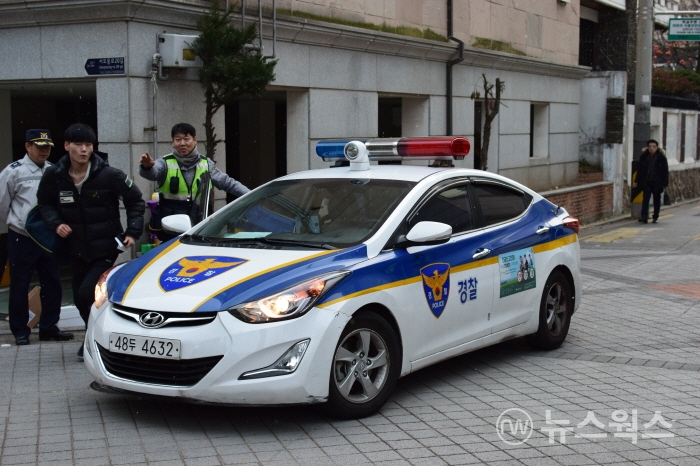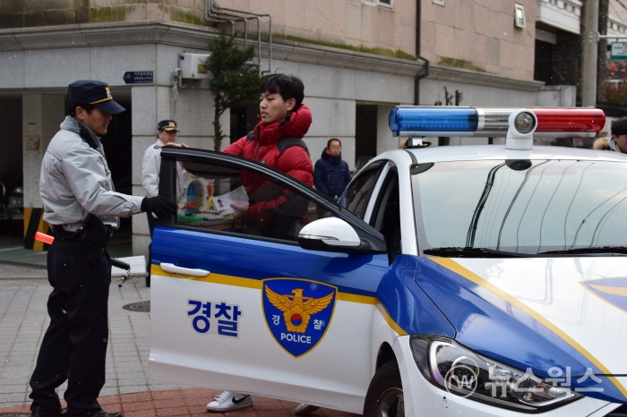 [뉴스웍스=박경보 기자] 2018학년도 대학수학능력시험이 치러진 23일 오전 8시 5분경, 수험생들이 경찰차와 자원봉사자 이륜차를 타고 시험장인 선정고등학교(서울 은평구)에 입장하고 있다. <사진=박경보 기자>