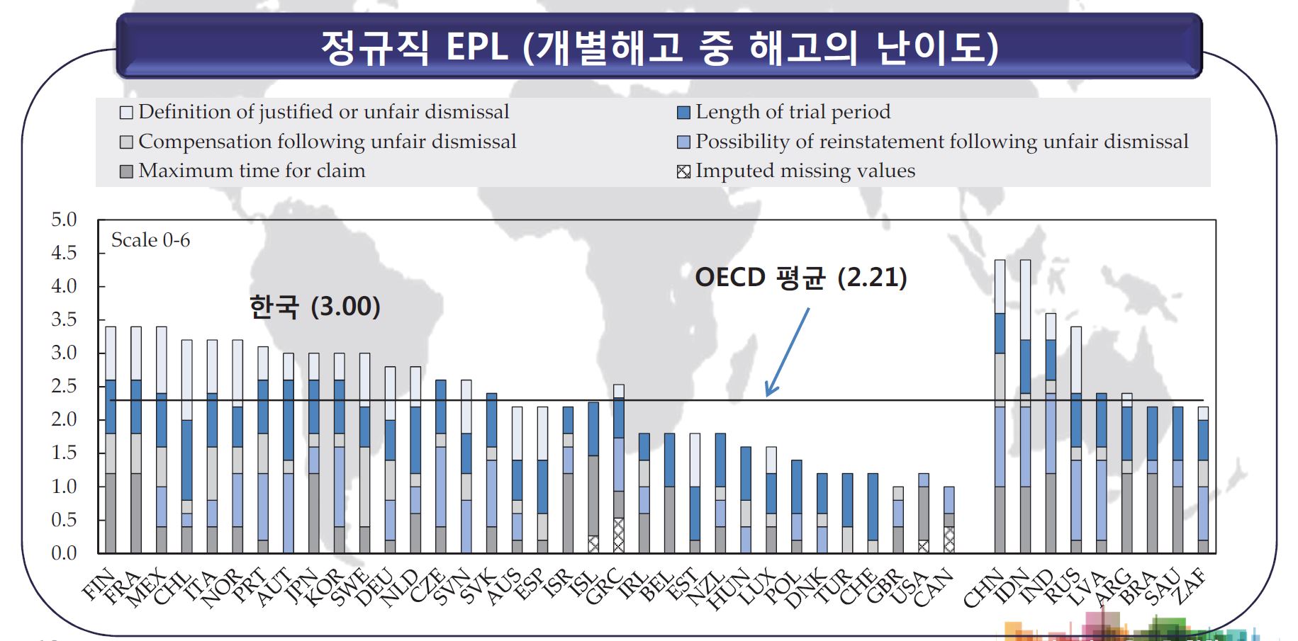 문제는 정규직 채용이 비단 ‘임금’의 문제만이 아니라는 점이다. 정규직에 대한 각종 고용보호법제는 기업의 정규직 채용을 위축시킨다. 한국의 정규직 근로자에 대한 개별 해고는 OECD 국가 중 8위 수준으로 임의적인 해고가 매우 어려우며, 부당해고로 드러날 경우 무조건 복직이 보장되는 3개 국가 중 하나이기도 하다. 또한 고용조정비용은 세계경제포럼(WEF) 기준으로 144개국 중 22위로 칠레, 중국, 예멘과 유사한 수준이며 OECD 국가 중에서는 2위다. 퇴직금만을 높고 봤을 때 해고비용은 OECD 5위에 속한다.
