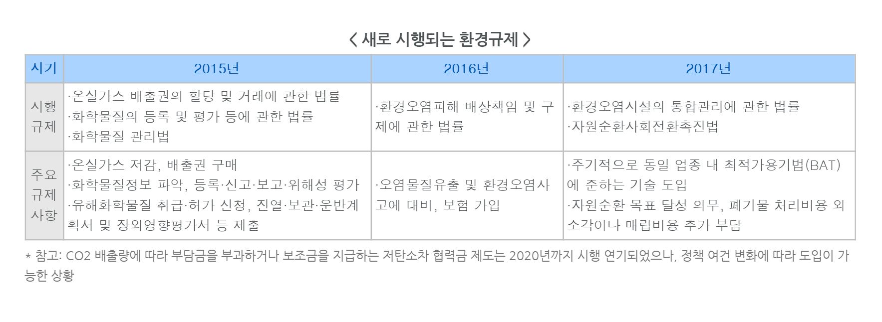 올해부터 이미 온실가스 배출권의 할당 및 거래에 관한 법률 등을 시행한 정부가 내년부터는 환경오염피해 배상책임 및 구제에 관한 법률 등을 시행할 계획이어서 산업계의 부담이 점차 무거워지는 상황이다. 전경련의 보고서 내용을 정리하자면 이렇다.