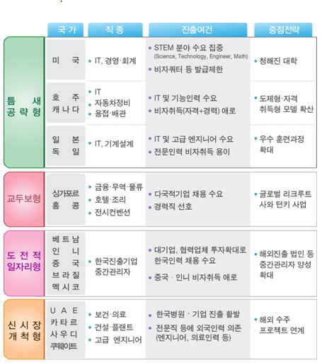 취업 수요가 많은 미국, 호주, 일본, 캐나다 등 선진국은 치기공, IT, 자동차 정비, 기계설계, 용접, 배관, 경영회계 등의 직종으로 틈새공략을 유도한다.