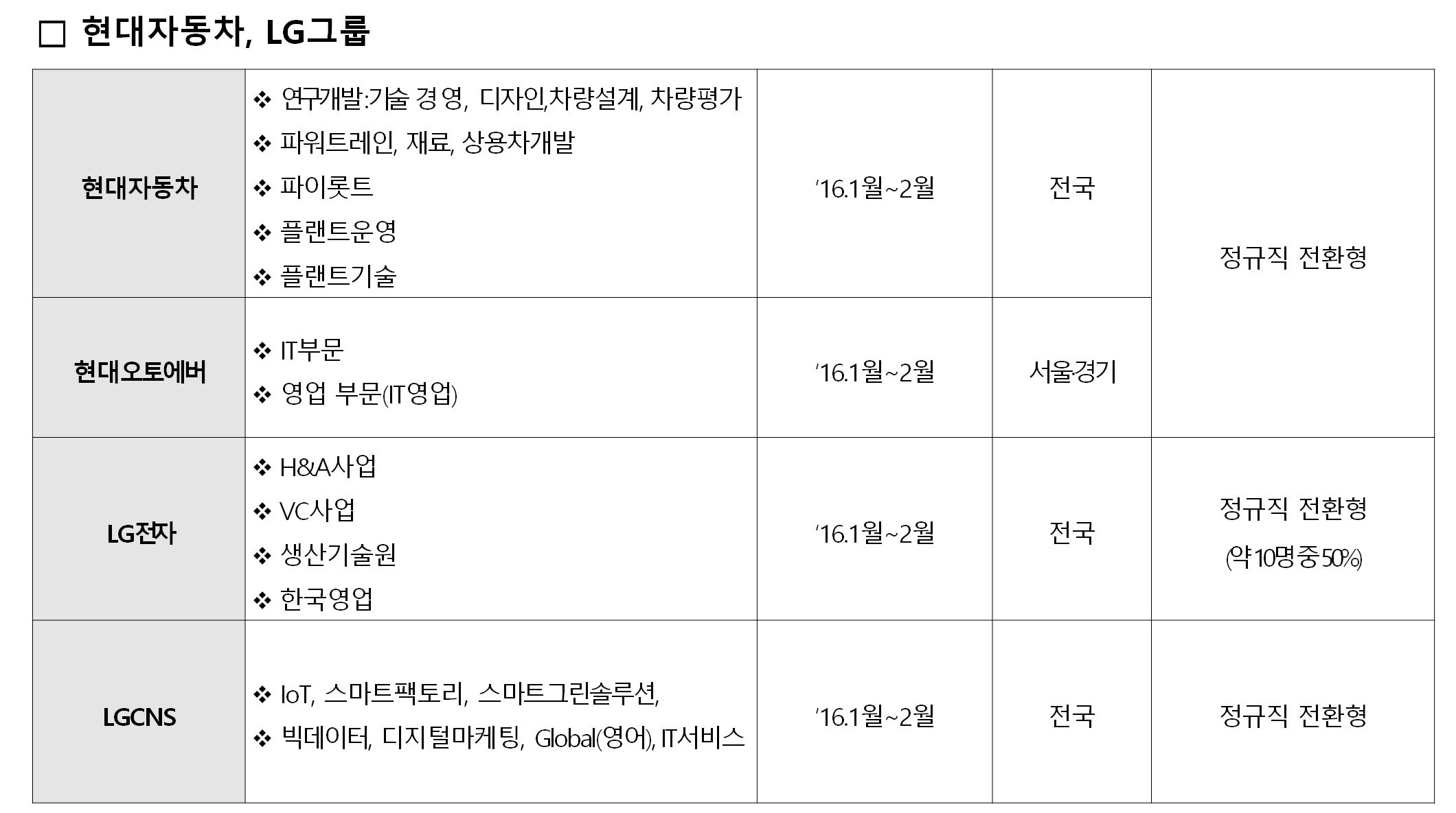 LG그룹은 LG전자, LG CNS 등 2개 계열사에서 인턴을 뽑는다. LG전자는 생활가전 및 H&A(자동화부품)사업, VC(전장부품)사업, 생산기술원, 한국영업 등 4개 직군에서 10여 명의 정규직 전환형 인턴을 채용하겠다는 계획이다. 2개월(’16.1월~2월) 인턴십 이후, 임원면접을 통해 약 50%가 정규직으로 전환된다.