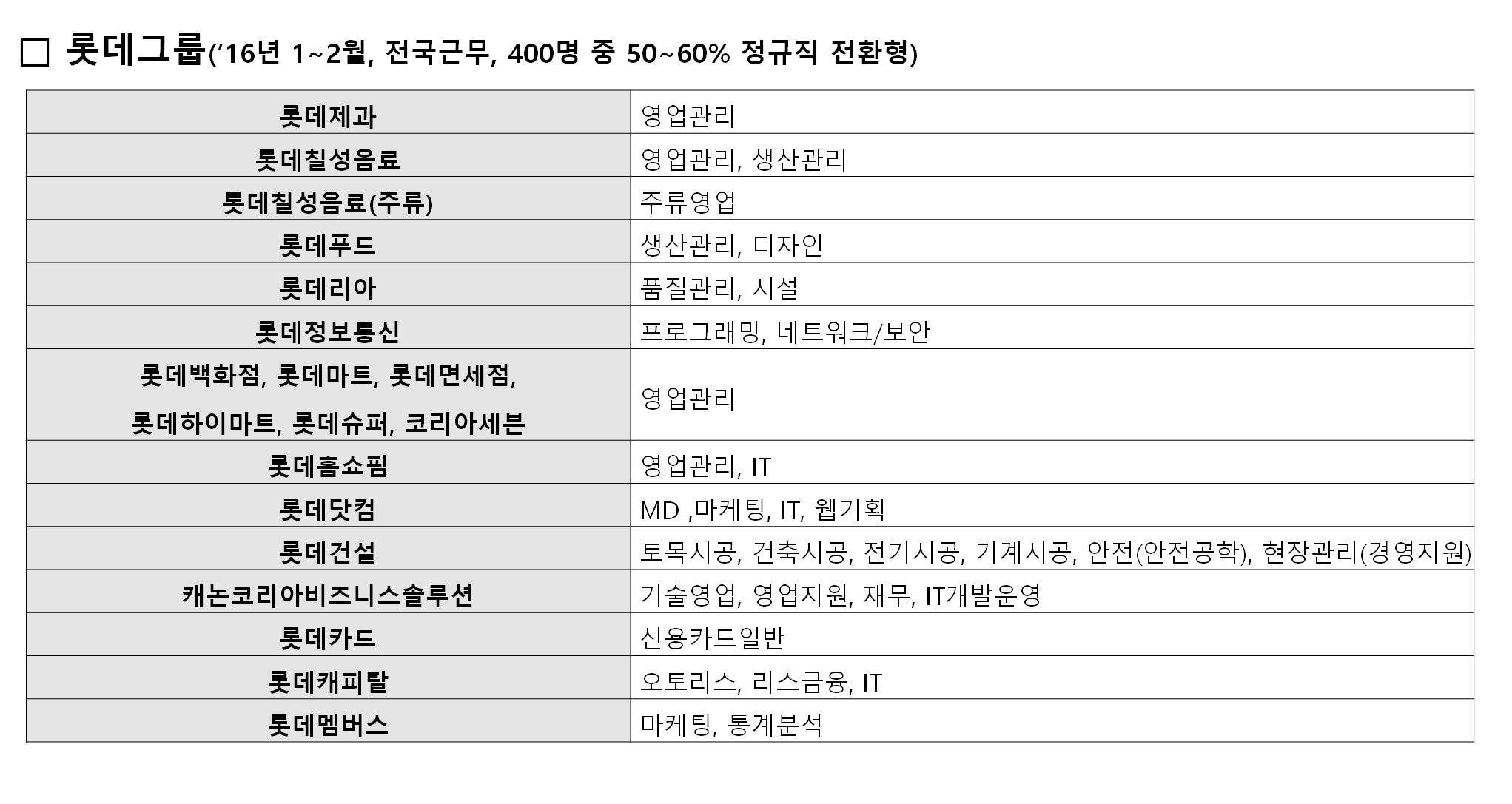 롯데그룹의 경우 식품(롯데제과, 롯데칠성음료, 롯데푸드, 롯데리아 등 4개社), 서비스(롯데정보통신 등 1개社), 유통(롯데백화점, 롯데마트, 하이마트, 롯데면세점, 롯데슈퍼, 코리아세븐, 롯데홈쇼핑, 롯데닷컴 등 8개社), 건설· 제조(롯데건설, 캐논코리아비즈니스솔루션 등 2개社), 금융(롯데카드, 롯데캐피탈, 롯데멤버스 등 3개社)등 5개 부문에서 400명의 정규직 전환형 인턴을 선발한다. 역시 2개월(‘16.1월 ~2월) 인턴십 이후 평가우수자로 선정된 50~60%가 정규직으로 전환된다.