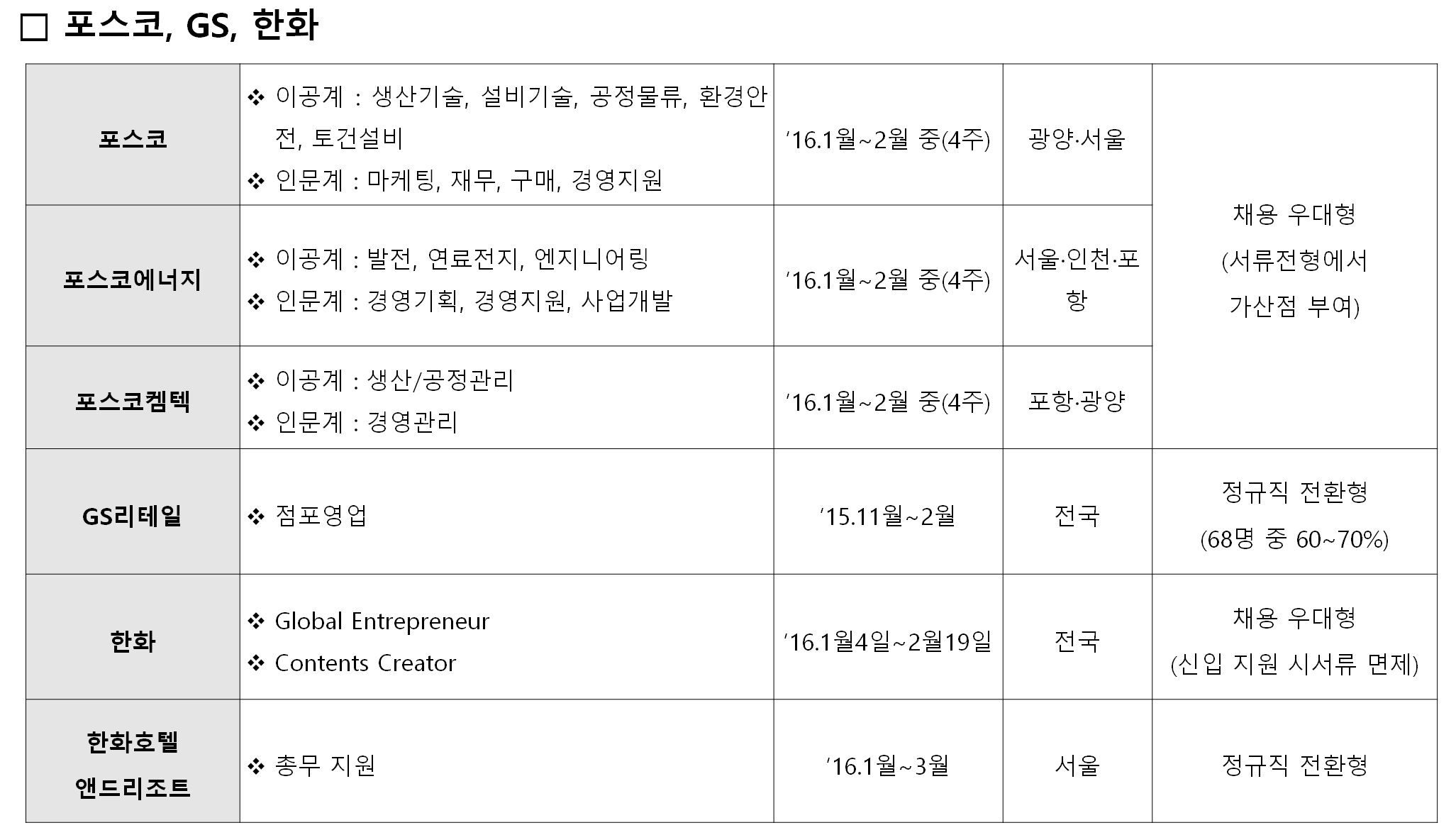 포스코그룹은 포스코, 포스코에너지, 포스코켐텍 등 3개 계열사에서 인턴을 뽑을 계획이다. 포스코는 이공계(생산기술, 설비기술, 공정물류, 환경안전, 토건설비 등 5개 분야), 인문계(마케팅, 재무, 구매, 경영지원 등 4개 분야)등 2개 직군에서 채용 우대형 인턴을 선발한다. 4주(‘16.1월 ~2월 중) 인턴십 이후, 평가우수자는 서류전형에서 가산점을 받는다.