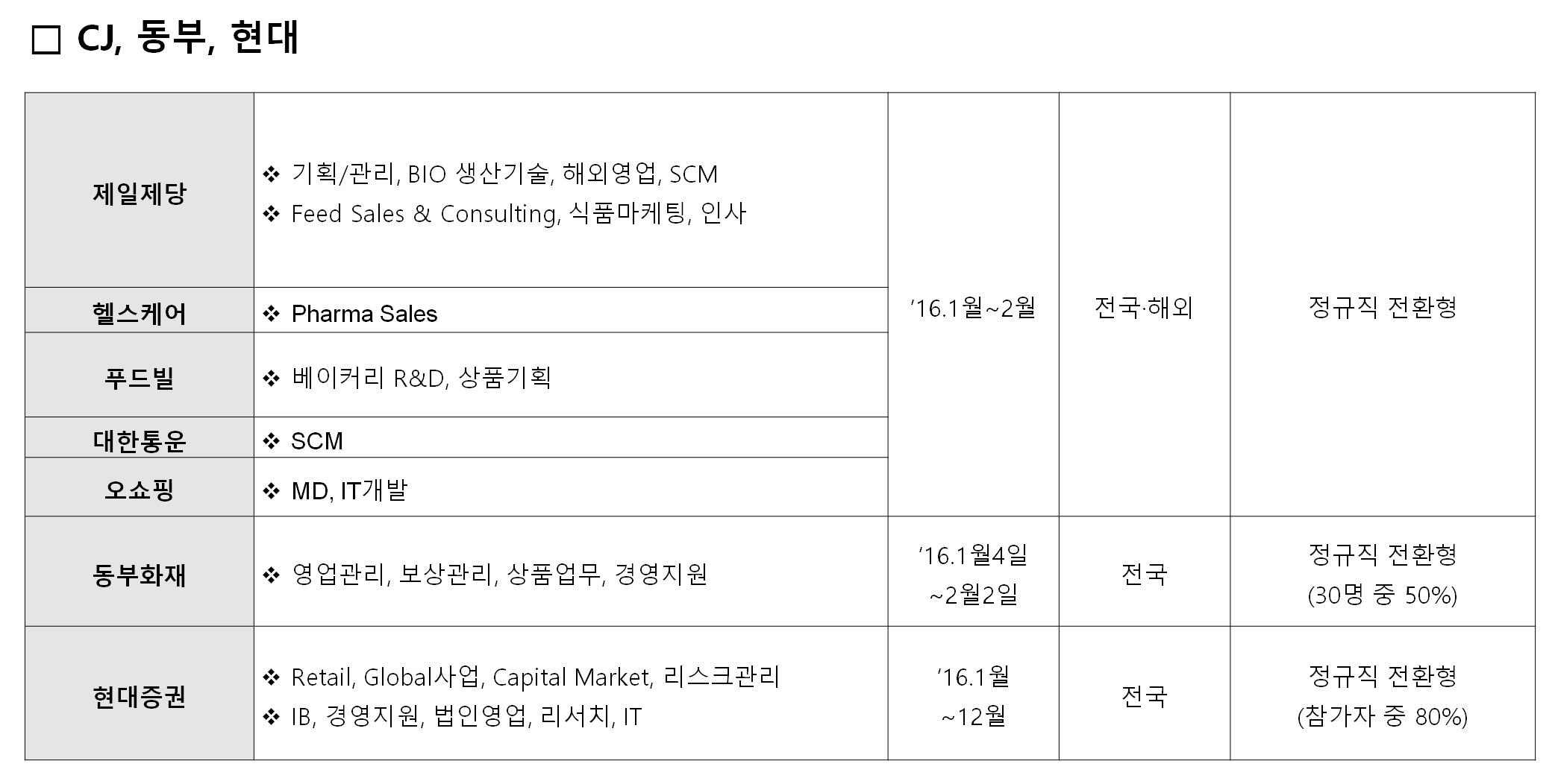 CJ그룹은 제일제당, 헬스케어, 푸드빌, 대한통운, 오쇼핑 등 5개 계열사에서 정규직 전환형 인턴을 선발한다. 2개월(’16.1월~2월) 인턴십 이후, 평가우수자는 정규직으로 전환된다.