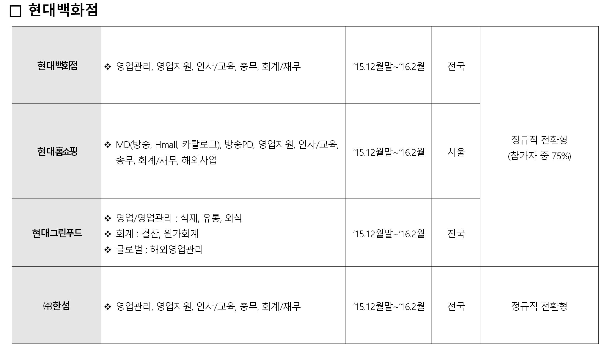 현대백화점그룹은 현대백화점, 현대홈쇼핑, 현대그린푸드, 한섬 등 4개 계열사에서 인턴을 뽑을 예정이다. 현대백화점은 영업관리, 영업지원, 인사/교육, 총무, 회계/재무 등 5개 분야에서 정규직 전환형 인턴을 선발한다. 9주(’15.12월 말~’16.2월) 인턴십 이후, 임원면접을 통과한 약 75%가 정규직으로 전환된다.
