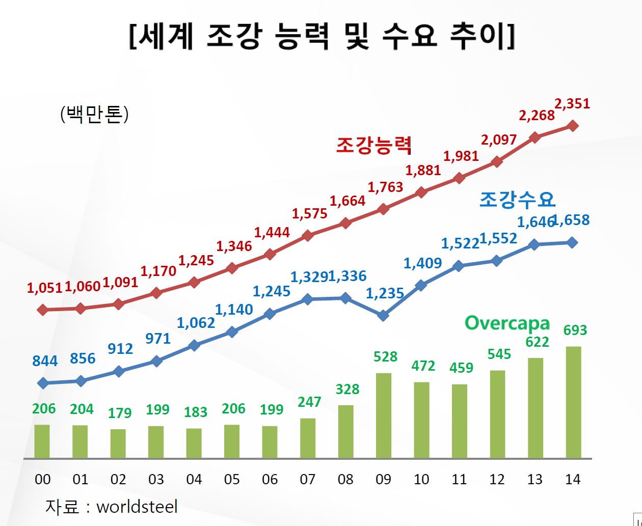 지난 2001년 조강(철강생산)능력은 105억톤이었으며 실제 생산량인 조강수요는 84억톤에 불과했다. 한편 지난해 조강능력은 235억톤, 조강수요는 169억톤까지 늘어났다. 약 14년간 두 배넘게 수요와 공급 규모가 증가했으나 공급과 수요 갭(차이)은 더욱 확대했다.