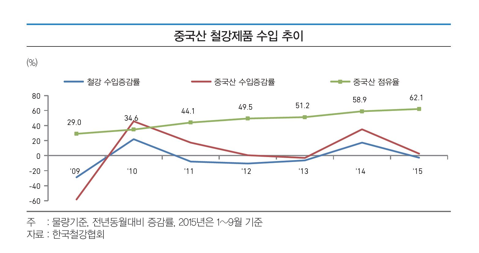 특히 중국의 저가 철강재는 국내 시장을 잠식할 우려까지 나오고 있다. 열연강판, 중후판 등 판재류의 중국산 수입물양이 많은 비중을 차지하는 가운데 최근에는 철근이나 봉, 형강류 수입까지 급증하고 있는 추세다. 이처럼 밀고 들어오는 중국산 제품으로 국내 수입재 가격이 40% 하락했으며, 평균 유통가 대비 중국산 철강재의 가격이 80%까지 떨어져 높은 가격경쟁력을 보이고 있다.