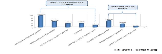 또한 응답 기업의 30.7%가 중복규제로 인한 문제점으로 ‘시간·비용·인력 추가 부담으로 인한 기업경쟁력 저하’를 꼽았다. 그 다음으로 법규 해석을 둘러싼 불필요한 갈등유발(17.2%), 상충되는 정책집행으로 사업활동 혼선·지연(15.2%), 신규 투자기회 상실·포기 등 정상적인 기업활동 차질(10.2%) 등의 응답이 이어졌다.
