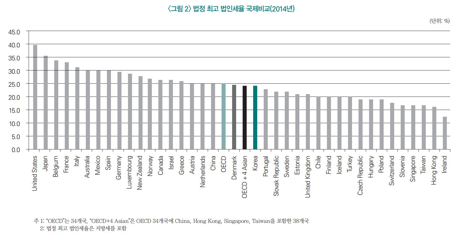 하지만 실제 OECD 국가들의 평균 법정최고 법인세율(지방세 포함)은 25%로 우리가 크게 낮지 않은 상황이며, 우리의 수출 경쟁국가인 중국·홍콩·싱가포르·대만 등을 포함시킬 경우에는 평균 24.3%까지 떨어져 사실상 우리와 같다고 할 수 있다.