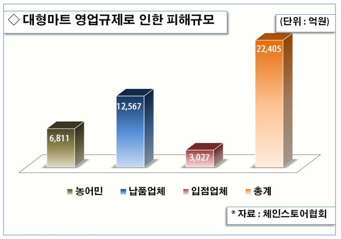 뿐만 아니라 대형마트 납품업체와 농어민들, 대형마트내 입점 중소상인까지 피해를 입는 부작용도 나타났다. 지난해 대법원의 대형마트 의무휴업 소송을 담당했던 법무법인(김종필 변호사)에 따르면 마트 규제로 납품업자의 매출감소 피해액이 연간 1조6891억원에 달하고 이 중 농어민이나 중소협력업체의 손해액이 8700억원을 차지한다.