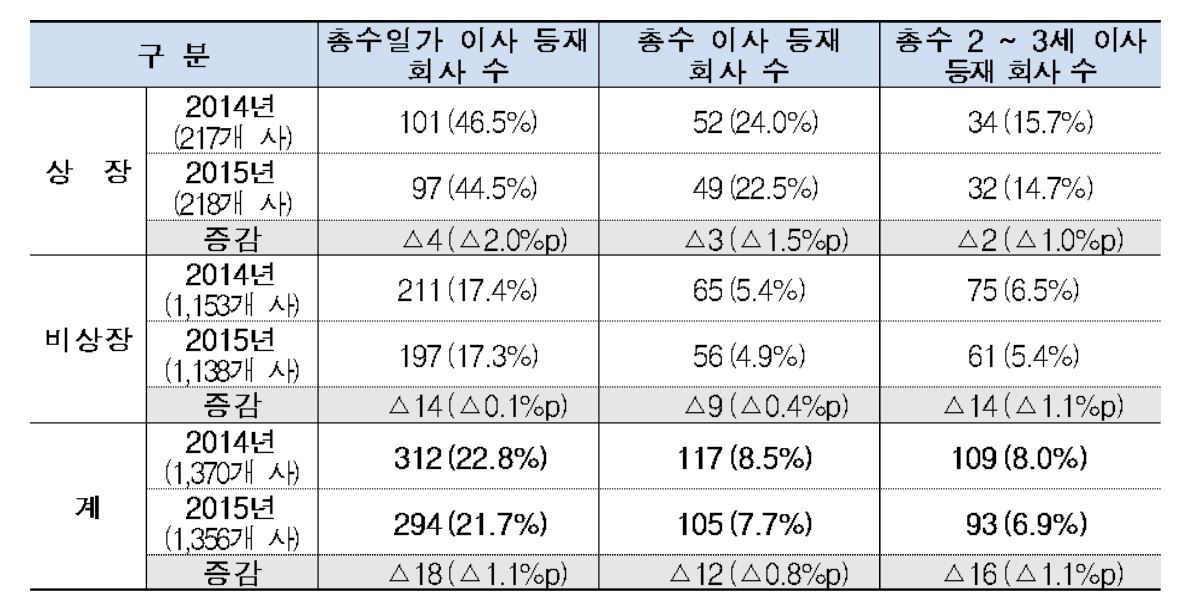 지난해 12월 공정거래위원회가 조사한 ‘2015년 대기업집단 지배구조 현황 분석’자료를 보면, 국내 40대 대기업집단 소속회사 중 총수 가족 중 1명이상 이사로 등재된 회사는 294개로 대상기업 1356개사의 21.7%에 불과했다. 지난 2014년 312개(22.8%)에 비해 감소한 수치다.