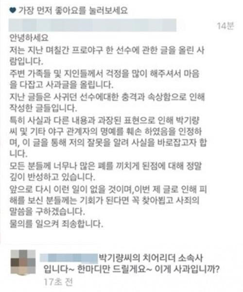 SNS로 사과글 올렸지만.. 네티즌 비난여론 들끓어