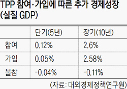 대외경제정책연구원(KIEP)은 2013년 TPP와 관련, 한국이 TPP에 가입하면 발효 후 10년간 총 1.8% GDP 증대 효과가 있지만 계속 가입하지 않으면 0.12% 감소할 것으로 내다봤다.