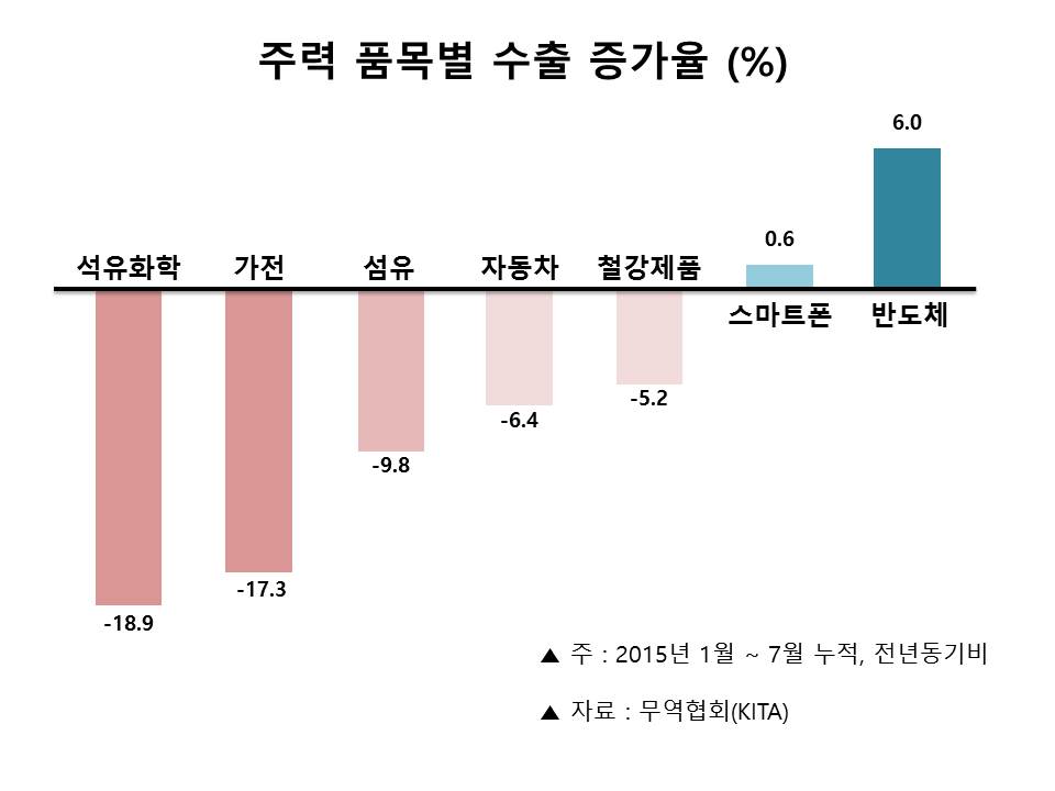 한국무역협회가 조사한 전년대비 올해 1~7월 품목별 수출증가율을 보면 반도체(6.0%)와 스마트폰(0.6%)를 제외하곤 대부분 품목이 마이너스 성장률을 기록했다.