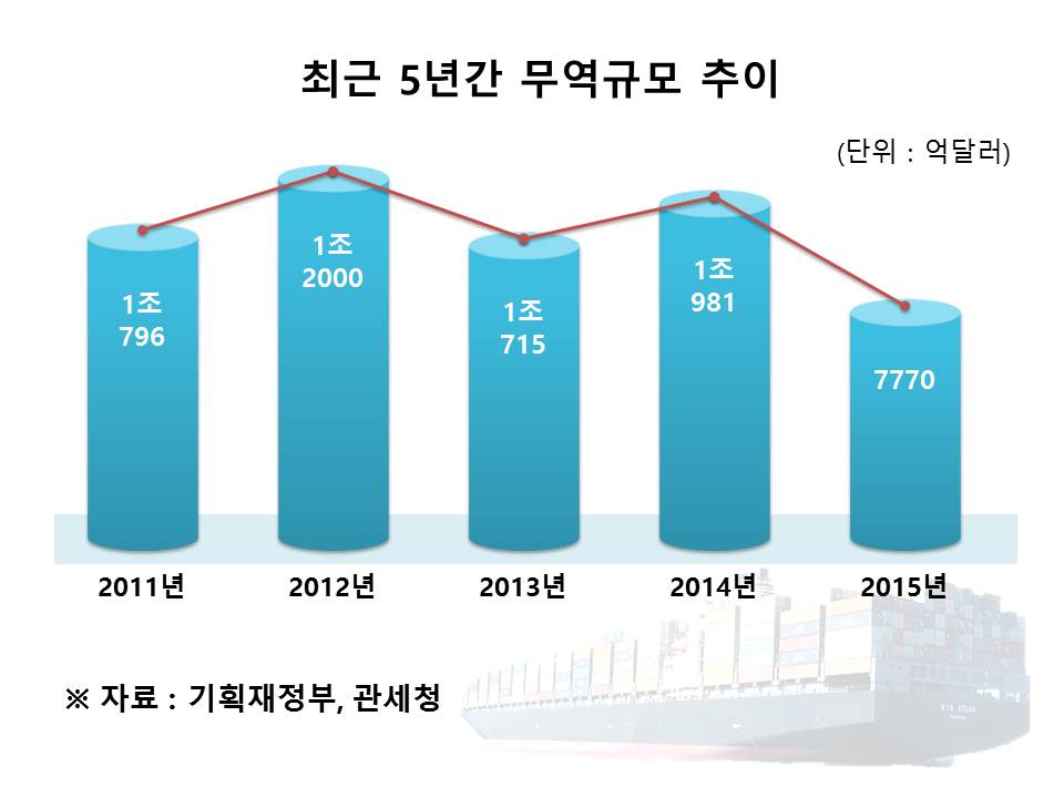 국제통화기금(IMF)이 조사한 올해 상반기 세계 교역물량 증가율은 1.5%로 지난해 같은기간 3.3%의 절반에도 못미친다. 이처럼 ▲세계 경기 침체에 따른 수요둔화 그리고 ▲중국 등 후발국과의 경쟁심화 ▲글로벌 공급과잉 ▲수출주력품목의 해외생산 확대 ▲저유가 ▲국제 환율변화(엔저, 위안화절하 등) 등이 우리나라 수출부진의 대외변수, 즉 구조적요인으로 분석된다.