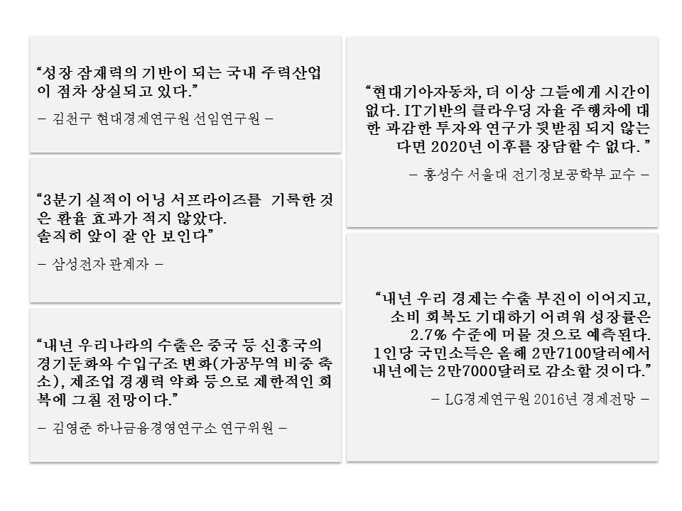 대한민국의 미래가 밝지 않다고 한다. 미국의 금리인상, 중국의 경기둔화, 일본의 TPP가입, 청년실업률증가, 그리고 내년 우리나라의 경제전망치…불확실하고 부정적인 것 투성이다. 데이터도 그렇게나온다. 우리나라의 내년 성장률은 2%후반대(민간경제연구소 평균치)에 머물것으로 보인다. 세계 경제성장률(3.2%)예상치에도 미치지 못하는 수준이다. 수출은 부진하다. 올해 5년연속 1조억달러 수출달성은 이미 물 건너간 듯하다. 이런 전망 속에 방법을 찾지도 않으면서 넋 놓고 있는 것은 무모하다. 그렇다고 세계 여러나라가 힘드니 ‘이 또한 지나간다’라고 낙관적인 기대를 하는 것도 허무맹랑하다.