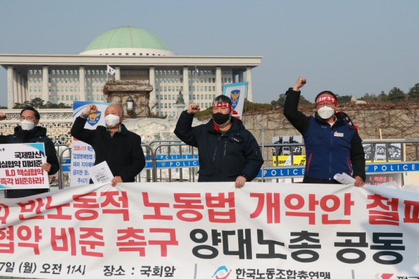 양대노총은 7일 서울 여의도 국회 앞에서 기자회견을 열고 "독단적인 노동개악 추진을 중단하고 노동자의 의견을 들어 ILO 기준에 부합하는 개정에 나서라"고 촉구했다.