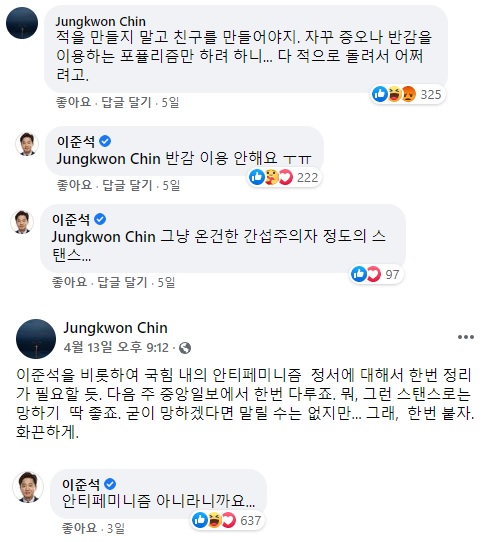 "이번에 온 건 충격파에 불과하다. 제가 밤에 술 먹고 밥 먹는 걸 별로 안 좋아해서 평소 저녁 약속을 잘 안 잡는 스타일인데, 이번 선거 이후에는 4월 말~5월 초까지 저녁 식사 일정이 꽉 찼다. 제가 거부할 수 없는 게 우리 당 의원님들도 '대체 이게(젠더 갈등) 뭔지 좀 나도 알려달라' 그러신다. 지금 의원님들이 예전과 다르게 굉장히 관심이 많다.
