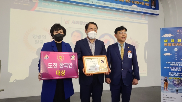 [뉴스웍스=원성훈 기자] '도전의 아이콘', '맨발의사나이'로 불리는 조승환 씨가 지난 4월 22일 '얼음 위에 맨발로 서 있기 세계신기록'을 경신했다. 조 씨는 이날 오후 서울시청 시민청 태평홀에서 열린 '빙하의 눈물을 보여주다'라는 극한의 퍼포먼스를 통해 종전 자신의 기록이자 세계신기록인 2시간 35분을 넘어선 2시간 40분을 기록하면서 또 한 번 새로운 역사를 열었다. 이날 행사는 지구의 날 52주년을 맞아 이뤄졌으며 전라남도 체육회(회장 김재무)가 후원했다.