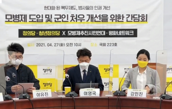 [뉴스웍스=조영교 기자] 최근 정치권에서 군 모병제 전환 등이 화두되는 가운데 정의당이 27일 '모병제 추진 및 군인 처우개선' 간담회를 열고 "언제까지 징병제를 고집할 수만은 없다"고 주장했다.