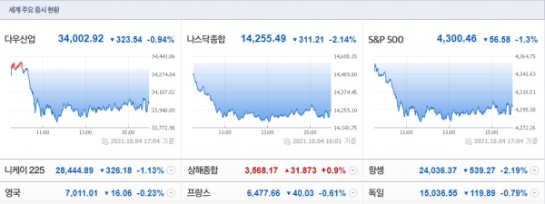 4일(미 동부시간) 뉴욕증권거래소(NYSE)에서 다우존스30산업평균 지수는 전장보다 323.54포인트(0.94%) 내린 3만4002.92로 장을 마쳤다. 스탠더드앤드푸어스(S&P)500 지수는 전장보다 56.58포인트(1.3%) 하락한 4300.46으로, 기술주 중심의 나스닥 지수는 전장보다 311.21포인트(2.14%) 밀린 1만4255.49로 거래를 끝냈다.