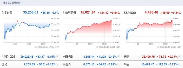18일(미 동부시간) 뉴욕증권거래소(NYSE)에서 다우존스30산업평균 지수는 전장보다 36.15포인트(0.1%) 떨어진 3만5258.61로 장을 마쳤다. 반면, 스탠더드앤드푸어스(S&P)500 지수는 전장보다 15.09포인트(0.34%) 상승한 4486.46으로, 기술주 중심의 나스닥 지수는 전장보다 124.47포인트(0.84%) 오른 1만5021.81로 거래를 끝냈다.