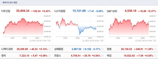 20일(미 동부시간) 뉴욕증권거래소(NYSE)에서 다우존스30산업평균 지수는 전장보다 152.03포인트(0.43%) 뛴 3만5609.34로, 스탠더드앤드푸어스(S&P)500 지수는 전장보다 16.56포인트(0.37%) 상승한 4536.19로 장을 마쳤다. 반면 기술주 중심의 나스닥 지수는 전장보다 7.41포인트(0.05%) 밀린 1만5121.68로 거래를 끝냈다.