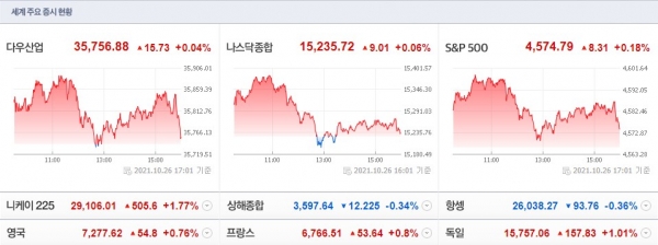 26일(미 동부시간) 뉴욕증권거래소(NYSE)에서 다우존스30산업평균 지수는 전장보다 15.73포인트(0.04%) 오른 3만5756.88로 장을 마쳤다. 스탠더드앤드푸어스(S&P)500 지수는 전장보다 8.31포인트(0.18%) 상승한 4574.79로, 기술주 중심의 나스닥 지수는 전장보다 9.01포인트(0.06%) 오른 1만5235.72로 거래를 끝냈다.