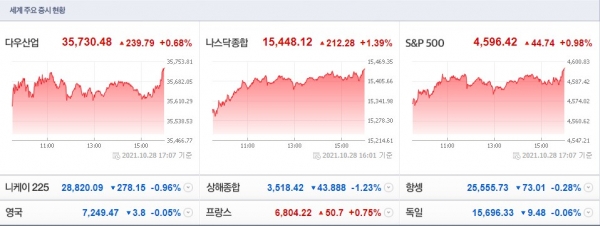 28일(미 동부시간) 뉴욕증권거래소(NYSE)에서 다우존스30산업평균 지수는 전장보다 239.79포인트(0.68%) 뛴 3만5730.48로 장을 마쳤다.