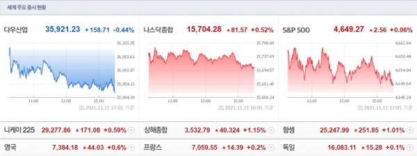 11일(미 동부시간) 뉴욕증권거래소(NYSE)에서 다우존스30산업평균 지수는 전장보다 158.71포인트(0.44%) 떨어진 3만5921.23으로 장을 마쳤다.