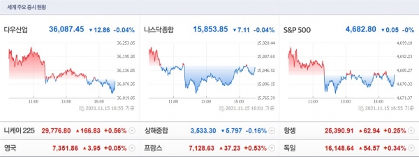 15일(미 동부시간) 뉴욕증권거래소(NYSE)에서 다우존스30산업평균 지수는 전장보다 12.86포인트(0.04%) 떨어진 3만6087.45로 장을 마쳤다.