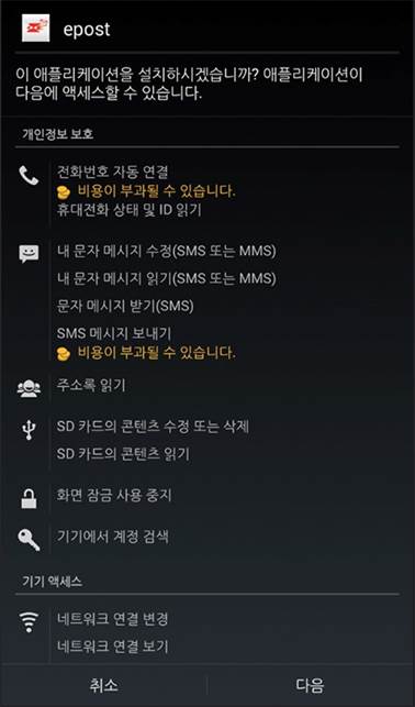 사용자가 무심코 '확인'을 누르면 스마트폰에 우체국 앱이 아닌 악성 앱이 설치된다. 악성 앱은 설치 후 문자메시지 발송 및 조작, 스마트폰 내 정보 탈취 등 금융사기에 이용될 수 있다.