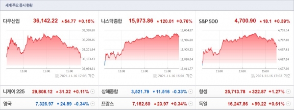 16일(미 동부시간) 뉴욕증권거래소(NYSE)에서 다우존스30산업평균 지수는 전장보다 54.77포인트(0.15%) 뛴 3만6142.22로 장을 마쳤다.