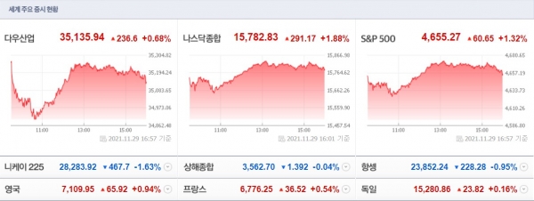 [뉴스웍스=이한익 기자] 뉴욕증시가 코로나19 변이 '오미크론'에 대한 우려가 진정되면서 일제히 반등했다.