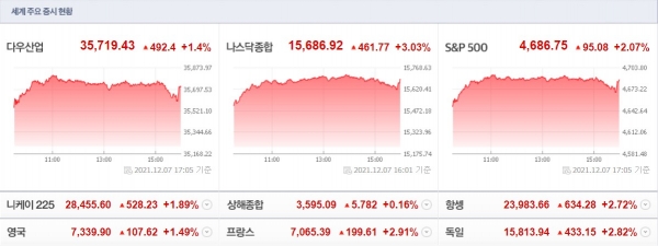 3대 주요 지수는 오미크론 변이가 델타 변이보다 덜 위험한 것 같다는 소식과 코로나19 치료제 관련 소식 등에 힘입어 상승한 것으로 풀이된다.