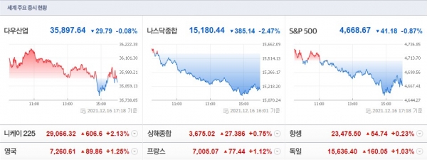 연준은 전날 자산매입 축소 규모를 기존 150억달러에서 1월부터 매달 300억달러로 테이퍼링을 가속화한다고 발표했다. 자산매입 프로그램 종료 시점은 기존 내년 6월에서 3월 종료로 앞당길 예정이며 내년 이후 3차례 금리인상이 있을 것으로 예상했다.