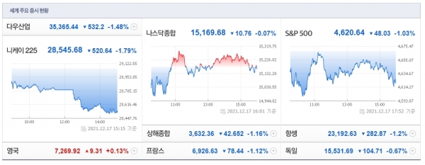 이날 뉴욕증권거래소(NYSE)에서 다우존스 30 산업평균지수는 전장보다 532.20포인트(1.48%) 내린 3만5365.44로 장을 마감했다. 스탠더드앤드푸어스(S&P) 500 지수도 전장보다 48.03포인트(1.03%) 밀린 4620.64로 장을 닫았다. 기술주 중심의 나스닥지수는 전장보다 10.75포인트(0.07%) 하락한 1만5169.68에 거래를 마쳤다.