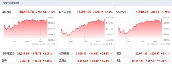 [뉴스웍스=이한익 기자] 뉴욕증시가 일제히 상승 마감했다. 코로나19 오미크론 변이 확산에 따른 미국의 봉쇄 조치 불확실성이 해소되면서 성장주, 경기민감주 중심으로 저가매수세가 유입되면서 큰 폭으로 반등했다.