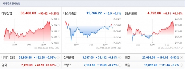 한지영 키움증권 연구원은 "미국 증시는 연말 증시 폐장을 앞두고 전반적인 거래가 부진한 가운데, 오미크론 관련 뉴스, 성장 및 테크주들의 차익실현 압력, 연말 및 연초 소비 기대감과 증시 랠리 기대감 등을 소화하며 혼조세로 마감했다"고 분석했다.