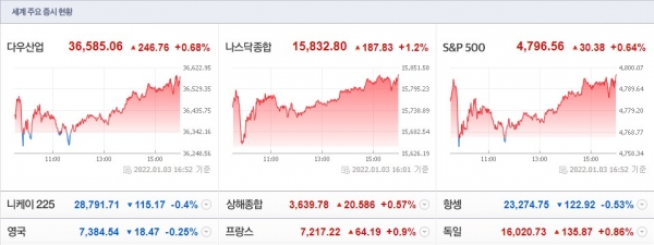[뉴스웍스=이한익 기자] 뉴욕증시 주요 지수가 일제히 상승으로 마감했다. 다우 지수와 S&P500 지수는 새해 첫 거래일부터 사상 최고치를 기록했다.