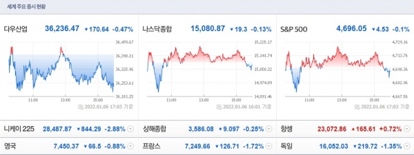 6일(미 동부시간) 뉴욕증권거래소(NYSE)에서 다우존스30산업평균 지수는 전장보다 170.64포인트(0.47%) 내린 3만6236.47로 장을 마쳤다.
