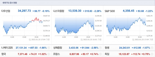 시장은 이날부터 시작된 1월 연방공개시장위원회(FOMC) 정례회의와 우크라이나를 둘러싼 전쟁 위험 등에 집중하고 있다. 연준은 오는 3월 기준금리 인상을 위한 발판을 마련할 것으로 예상되고 있다.