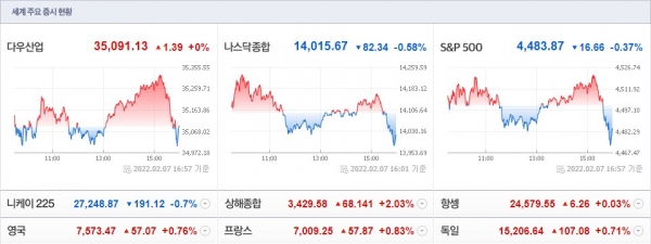 한지영 키움증권 연구원은 "미국 증시는 금리 상승 부담에도 리오프닝 기대감, 개별 기업 실적 기대감 등으로 장중 상승세를 보였으나, 장후반 러시아와 서방국가간 지정학적 긴장감 재고조 등이 차익실현 압력을 자극하며 하락세로 마감했다"며 "이번주 미국 1월 CPI 발표를 앞둔 경계감, 미국 고용보고서 여파로 재부각된 연준의 긴축 가속화 우려감, 우크라이나-러시아 지정학적 리스크 지속 등이 있었다"고 분석했다.