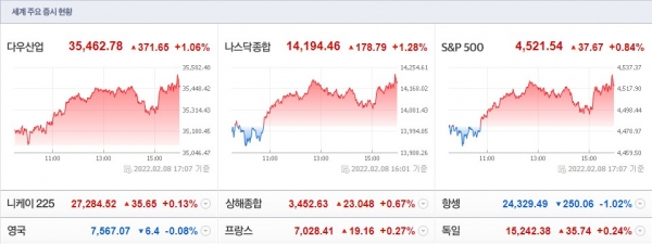 8일(미 동부시간) 뉴욕증권거래소(NYSE)에서 다우존스30산업평균 지수는 전장보다 371.65포인트(1.06%) 오른 3만5462.78로 장을 마쳤다.