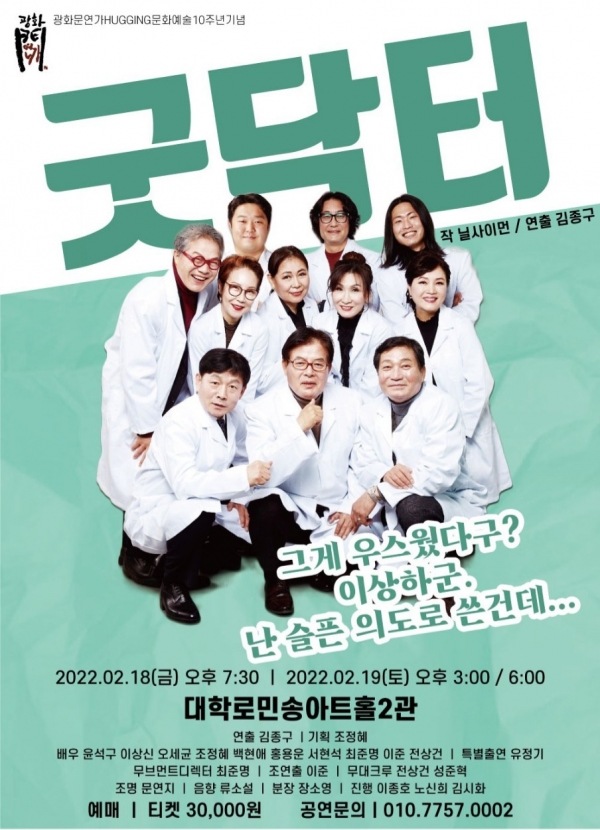 희극 굿닥터는 오는 18일 금요일 오후 7시 30분을 시작으로 19일 토요일 6시까지 이어진다. 장소는 서울시 성북구 혜화동 대학로민송아트홀2관이다.