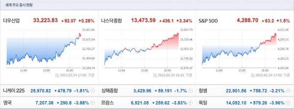 미국 증시 3대 지수는 러시아의 우크라이나 침공에 하락 출발했지만, 장중 조 바이든 미국 대통령의 대국민 연설 이후 애플, 마이크로소프트 등 대형 기술주를 중심으로 저가매수세가 유입되면서 낙폭을 축소했다.