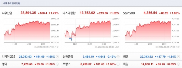 미국 증시 3대 지수는 러시아-우크라이나 2차 협상 소식, 시장 예상 수준의 파월 의장 청문회 발언 등에 힘입어 상승한 것으로 보인다.
